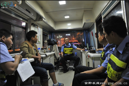 夜幕后,民警在移動警務(wù)室旁執(zhí)勤辦公