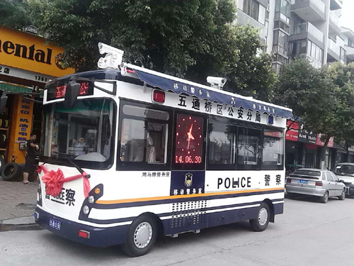 這是一款集移動巡邏、處置警情、移動監(jiān)控、宣傳咨詢及服務群眾等多功能為一體的警務用車,車頂前面及側面各安裝一塊顯示屏,可以不斷滾動播放宣傳字幕及視頻,還有多個不停閃爍的警示燈,對違法犯罪份子可以起到震懾警示作用。車頂配有一枚360度探頭和三枚定向探頭,可以實現(xiàn)對周邊區(qū)域的全方位掃描,車內民警可以將該車周邊的情況看得一清二楚,及時洞悉警情,如果發(fā)現(xiàn)險情,民警立刻能通過聲音輸出系統(tǒng),向外界發(fā)出警報。車身左側設置一個接待窗口,可以現(xiàn)場辦公,隨時接處警,對震懾犯罪起到積極作用。