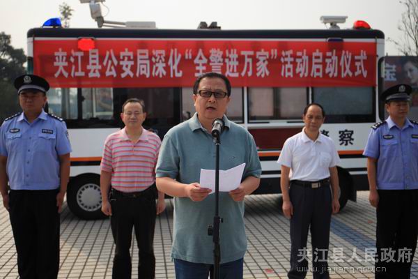為深入推進黨的群眾路線教育實踐活動,進一步轉(zhuǎn)變工作作風(fēng)、密切警民聯(lián)系,近日,夾江縣公安局在濱江廣場隆重舉行深化“全警進萬家”移動警務(wù)室啟動儀式。夾江縣委常委、政法委書記宋軍,縣人大副主任李國志,縣政協(xié)副主席鄧建斌出席儀式?h公安局黨委副書記、政委劉楊,全體黨委班子成員、警風(fēng)監(jiān)督員、各級新聞媒體記者、焉城鎮(zhèn)政府干部、社區(qū)干部和社會各界代表以及全局公安民警、武警官兵、消防官兵共500余人參加儀式。啟動儀式由副縣長、公安局長劉義主持。