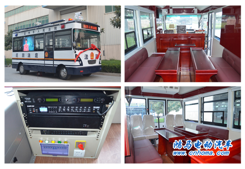 該院新購置的鴻馬移動巡回審判車集訴訟服務(wù)、巡回審判、法制宣傳、執(zhí)行指揮四大功能于一體,車內(nèi)設(shè)置有審判桌椅、電子公告牌、大型室外LED屏、審判法庭信息化系統(tǒng)等一系列設(shè)備,為保障全天候運行、特殊情況下執(zhí)法,還專門裝配了高功率照明攝像頭系統(tǒng)、擴音設(shè)備等器材,也是一個智能化、小型化、移動式的“科技法庭”。