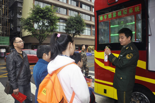 今年11月9日是全國第24個“119”消防宣傳日。為廣泛深入地普及火災(zāi)防范和火場逃生自救知識,11月9日,宜賓翠屏區(qū)消防大隊攜橙袖標(biāo)·正能量消防志愿者走上街頭,為群眾宣講消防安全知識。期間,大隊引進(jìn)的“消防移動體驗館”也在城區(qū)中山廣場首次亮相,免費向群眾開放參觀、體驗。