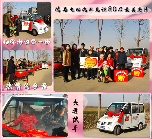 獲悉這個美麗的愛情故事后,森源鴻馬電動汽車總經(jīng)理馬鴻軍安排公司車間為這對80后夫妻量身定做了這臺象征著“最美愛情”的鴻馬新能源電動車,他說:得知洛陽這對年輕80后的愛情故事后很受感動,這項(xiàng)活動非常有意義,希望他們這種愛情觀喚起社會的關(guān)注,此次我們森源鴻馬公司捐贈一臺新能源電動車,希望能陪伴著這對80后夫妻風(fēng)雨同行。近幾年來,鴻馬電動汽車企業(yè)回饋社會,傳遞愛推動社會公益事業(yè),以實(shí)際行動踐行“感恩社會 關(guān)愛他人”。