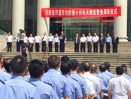 河南省許昌市向新疆公安機關(guān)贈送警務(wù)用車儀式現(xiàn)場。