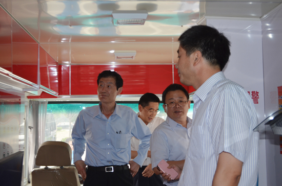 隨后,王躍華一行領(lǐng)導(dǎo)來到廣場(chǎng)展車區(qū)域,整齊排列的多款展車吸引了王躍華的目光,他親自登上鴻馬高科技移動(dòng)警務(wù)室、消防體驗(yàn)館進(jìn)行了實(shí)際體驗(yàn),并詳細(xì)詢問了產(chǎn)品性能。在參觀展車過程中,王躍華向公司副總經(jīng)理王秋榮詢問了公司相關(guān)產(chǎn)品的市場(chǎng)占有率,了解了相關(guān)展車的性能、技術(shù)參數(shù)及市場(chǎng)占有率等方面信息。