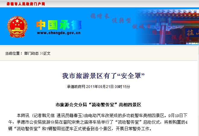 針對(duì)旅游景區(qū)治安工作實(shí)際,4輛“流動(dòng)警務(wù)室”投入使用后,將分別配備到避暑山莊、普陀宗乘之廟、普寧寺、磬錘峰四大景區(qū)內(nèi)治安狀況復(fù)雜的重點(diǎn)部位,并按照“一車(chē)兩警”的原則,為每輛流動(dòng)警務(wù)室配備正式民警,以便于及時(shí)發(fā)現(xiàn)和處理違法犯罪、受理群眾舉報(bào)投訴、方便廣大中外游客,力爭(zhēng)把每一輛流動(dòng)警務(wù)車(chē)都變成景區(qū)門(mén)口的警務(wù)工作站。