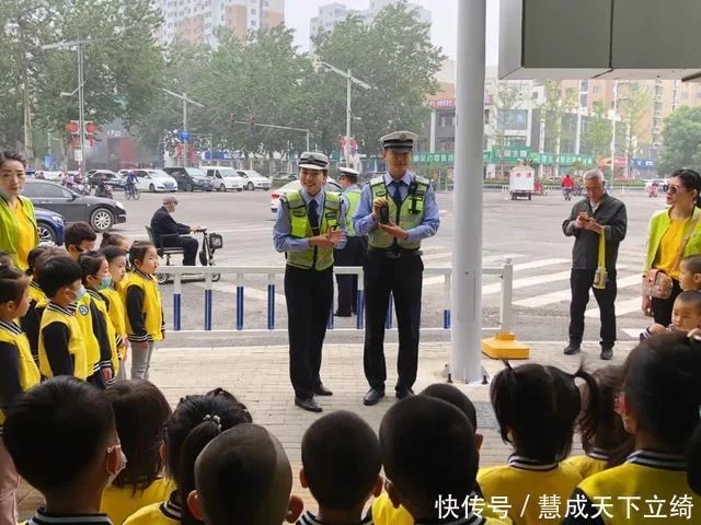 5月14日,在市區(qū)廣陽道與裕華路交口,公路上車輛川流不息。在交警執(zhí)勤警務(wù)室旁,一大隊交警正在耐心的給幼兒園小朋友們介紹交通信號燈、斑馬線、交通標志標線等設(shè)施的含義和作用。