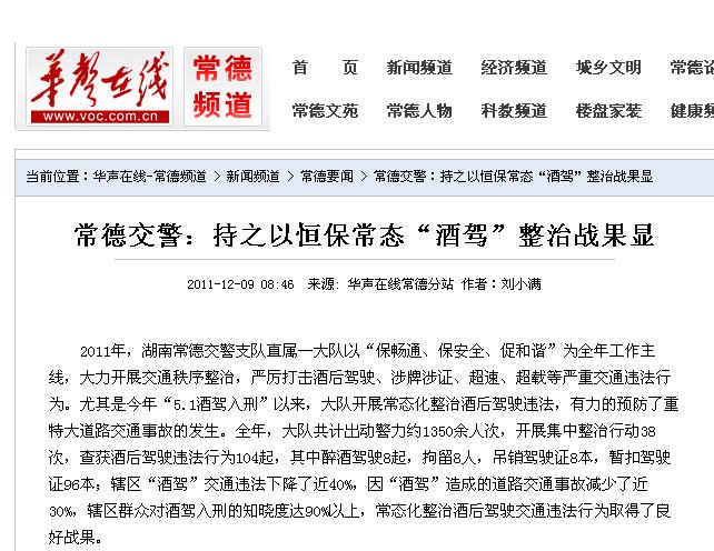 2011年,湖南常德交警支隊直屬一大隊以“保暢通、保安全、促和諧”為全年工作主線,大力開展交通秩序整治,嚴(yán)厲打擊酒后駕駛、涉牌涉證、超速、超載等嚴(yán)重交通違法行為。尤其是今年“5.1酒駕入刑”以來,大隊開展常態(tài)化整治酒后駕駛違法,有力的預(yù)防了重特大道路交通事故的發(fā)生。全年,大隊共計出動警力約1350余人次,開展集中整治行動38次,查獲酒后駕駛違法行為104起,其中醉酒駕駛8起,拘留8人,吊銷駕駛證8本,暫扣駕駛證96本;轄區(qū)“酒駕”交通違法下降了近40%,因“酒駕”造成的道路交通事故減少了近30%,轄區(qū)群眾對酒駕入刑的知曉度達(dá)90%以上,常態(tài)化整治酒后駕駛交通違法行為取得了良好戰(zhàn)果。