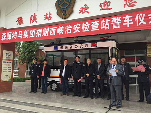 4月17日上午,在南陽西峽滬陜高速西坪檢查站舉行森源鴻馬治安檢查站警車捐贈儀式。南陽市公安局黨委委員、副局長路書劍,西峽縣人民政府副縣長袁璋,西峽縣公安局局長朱新昌、河南森源鴻馬電動汽車有限公司總經(jīng)理馬鴻軍等相關(guān)領(lǐng)導(dǎo)出席捐贈儀式。