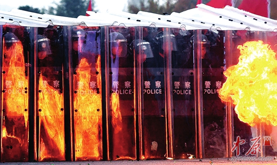 警察用盾牌擋住“歹徒”的自制燃燒瓶
