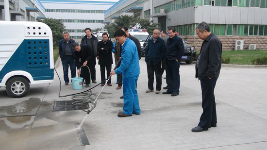 公司副總經(jīng)理王秋榮陪同評審小組成員觀看電動高壓清洗車演示
