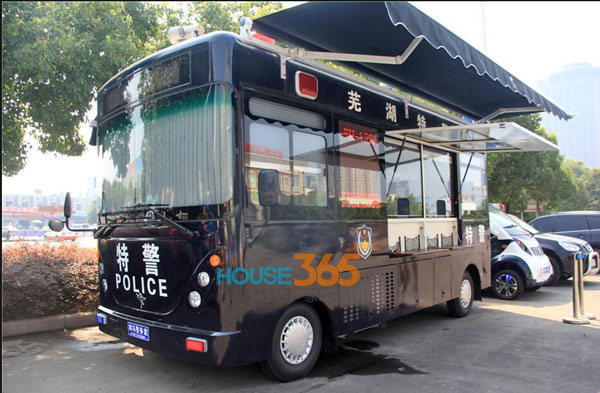 據(jù)介紹,“移動警務(wù)車”是充電式環(huán)保型電動車,車內(nèi)配備警用盾牌、警棍等警用設(shè)備及醫(yī)療器械、電腦、檔案箱,視頻監(jiān)控與信息實(shí)時傳送系統(tǒng)等一應(yīng)俱全,猶如一間小型辦公室,融合了固定執(zhí)勤崗?fù)ず鸵苿友策壾囕v兩種功能。執(zhí)勤工作中,民警可同時實(shí)現(xiàn)勻速移動、語音播報(bào)系統(tǒng)循環(huán)播報(bào)、GPS全球定位系統(tǒng)和4個視頻監(jiān)控?cái)z像頭全方位取證;能夠?qū)?0米范圍內(nèi)的4個方向?qū)嵤⿲?shí)時監(jiān)控,并有專人對4塊屏幕進(jìn)行24小時監(jiān)測,將警情第一時間傳送至蕪湖市公安局110指揮中心。