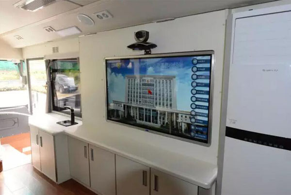 流動檢察室印制有統(tǒng)一標示,內部安裝視頻接訪、檢察業(yè)務對接、信息查詢等數(shù)字化設備。群眾在流動檢察室內通過視頻接訪系統(tǒng),實現(xiàn)點名接訪,檢察長或主要業(yè)務部門負責人可以在控申接待辦公室與當事人“面對面”交談,了解情況,解決問題。利用移動便民服務信息平臺,群眾可以在流動檢察室內隨時查看法律知識、惠民政策、涉農資金、案件信息、社區(qū)矯正對象名單等內容。