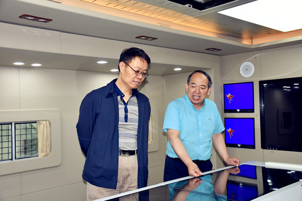 公司總經(jīng)理馬鴻軍為劉明望理事長(左)介紹森源鴻馬9米全地形移動(dòng)警務(wù)方艙