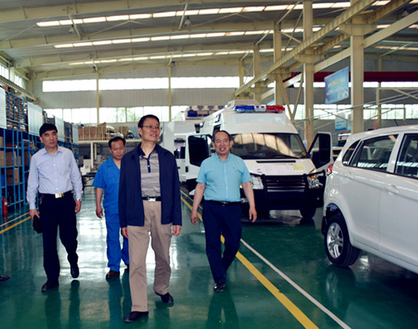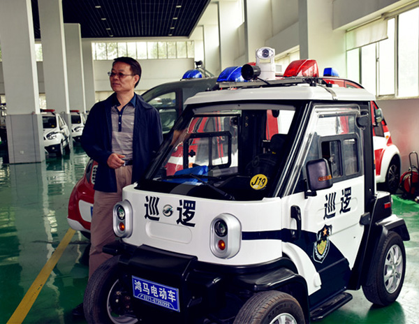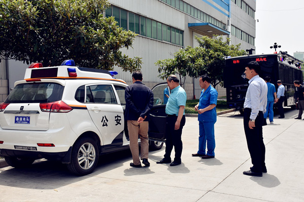 公司總經(jīng)理馬鴻軍為劉明望理事長一行介紹公司產(chǎn)品SUV電動(dòng)巡邏車