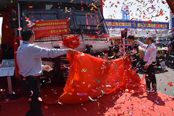 公司領(lǐng)導(dǎo)孔慶珍、馬鴻軍為新產(chǎn)品9米全地形移動警務(wù)方艙揭幕
