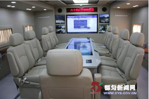 車的最前方是指揮車的駕駛部分,緊挨著駕駛部位的是小而精致的操作臺,別看這里只允許一個人進(jìn)行操作。但臺面上各處的空間都得了充分利用。無線傳真、打印機(jī)、手提電腦均設(shè)置在該操作臺上,使得操縱人員應(yīng)用得手、便捷。靠近車尾部分,是整面的監(jiān)控屏幕。中間是一個敞開的小型會議室,長型會議桌,橫穿整個指揮車中部,會議桌上還有觸摸式的屏幕和操控臺。坐在這里的指揮人員,可以直接觀看監(jiān)控屏幕,并能進(jìn)行會議研究,現(xiàn)場指揮處理各種事宜。
