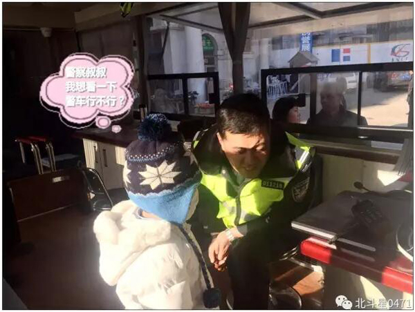 這不,在錫林南路五四商城路口上停的移動(dòng)警務(wù)車就迎來一個(gè)小朋友,值班民警很有耐心的向小朋友簡(jiǎn)單介紹著……
